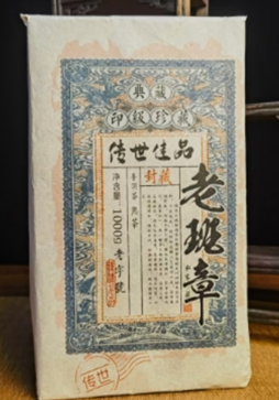 2012, tmavý puerh excelentní kvality lisovaný do tvaru velké cihly. Tmavě rudohnědý nálev zemité nasládlé až smetanové chuti typické pro tento Puerh s jasným a hutným dozvukem. Vůně lesního medu se prolíná s čerstvým tropickým ovocem, zejména papája a mango. Dozvuk je velmi dlouhý. Vhodný k pití ihned nebo na archivaci.