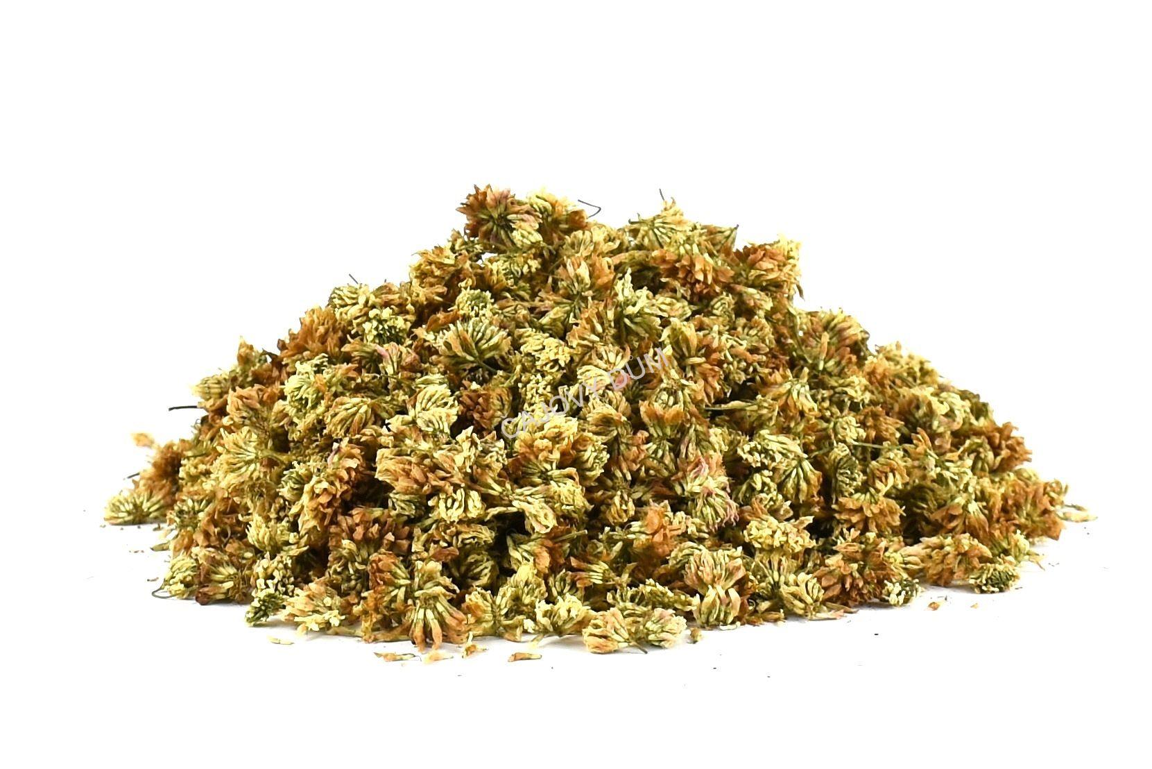 Sušená květenství (hlávky) jetele plazivého (Trifolium repens L. syn. Amoria repens (L.) C. Presl.), známého také jako jetel bílý, nebo jetelovec plazivý či plaňák.