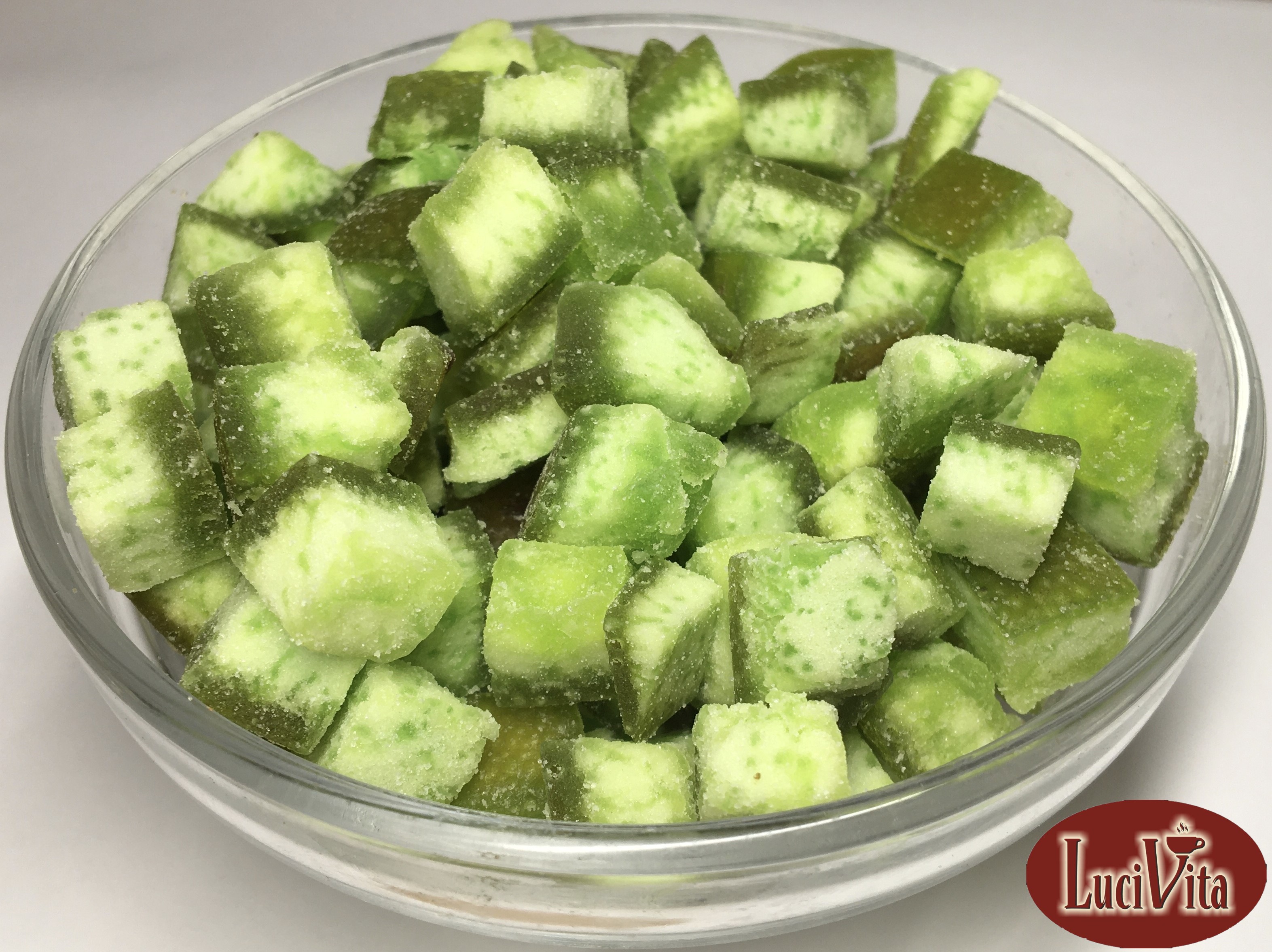 Složení: Pomelo kostky (52,77%), cukr (46%), kyselina citronová (1,2%), barviva E133, E102 (0,02%), konzervant E220: oxid siřičitý (0,01%)