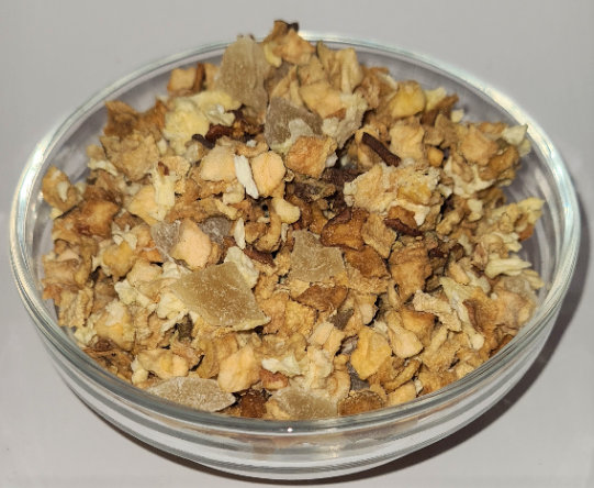 Složení: jablko plod, hruška plod, ananas mrazem sušený, ananas kandovaný (cukr, regulátor kyselosti: kyselina citrónová E330, KONZERVANT E220 – OXID SIŘIČITÝ