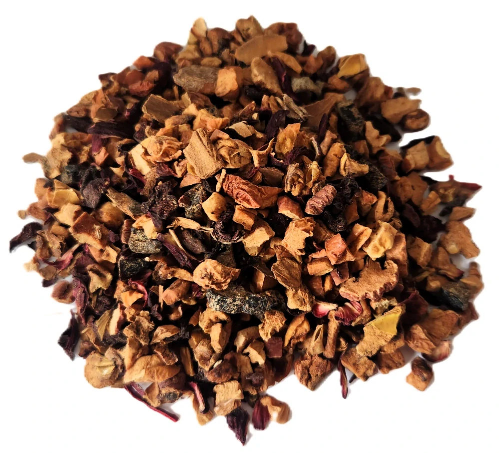 Složení: kousky švestek, jablka a červené řepy, skořice, květy ibišku, aroma.