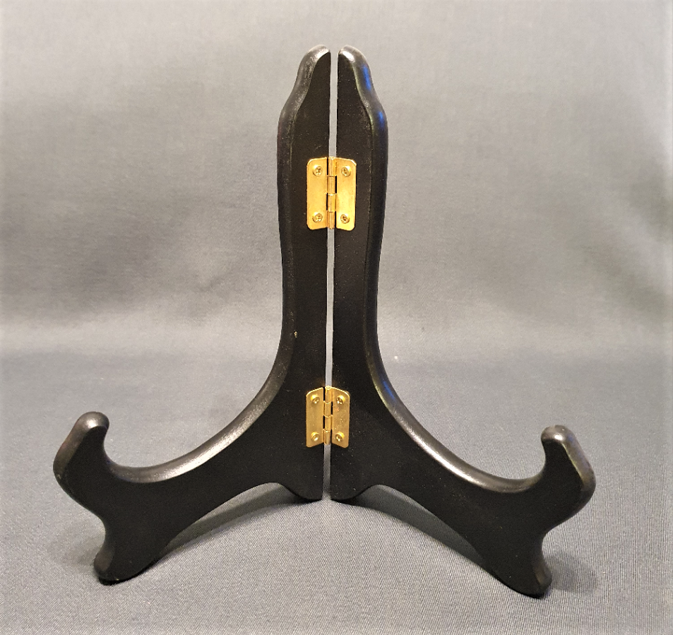 Stojánek na puerhové koláče. Černá lesklá barva krásně ladí s obalem koláčů, které tak vyniknou. Stojánek je vyroben ze dřeva. Skládá se ze dvou částí, které jsou spojené dvěma mosaznými panty, aby se stojánek dal skládat.